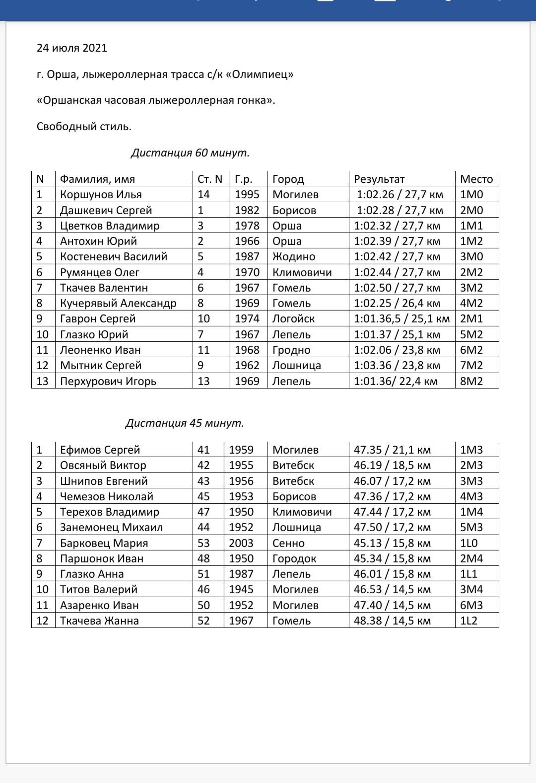 Илья Коршунов из Могилёва одержал победу в часовой гонке на лыжероллерах свободным стилем сегодня в Орше, опередив на финише Сергея Дашкевича из Борисова и Владимира Цветкова из Орши. Результат победителя 1:02.26 (21 кр. х1.32 км = 27,7 км).